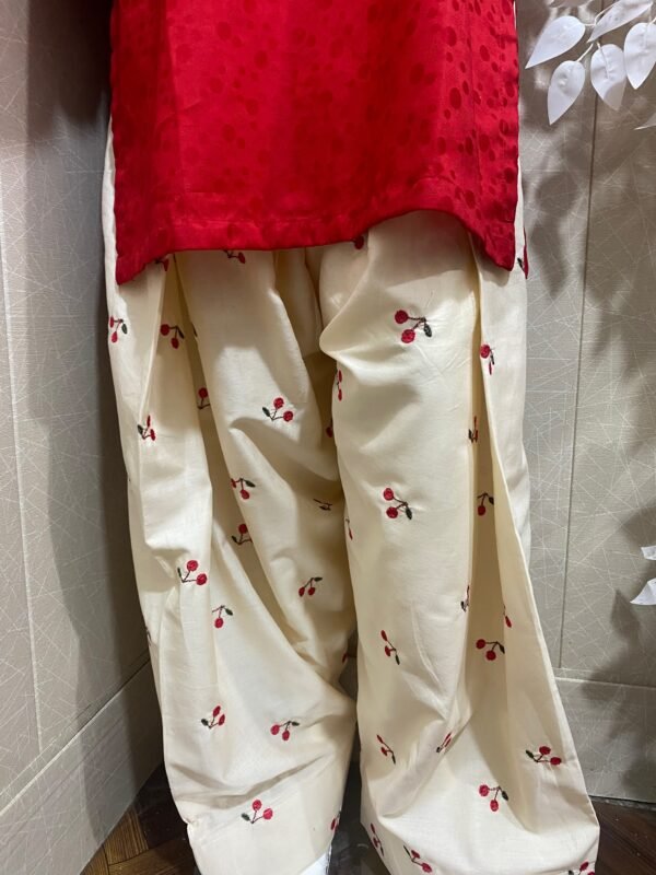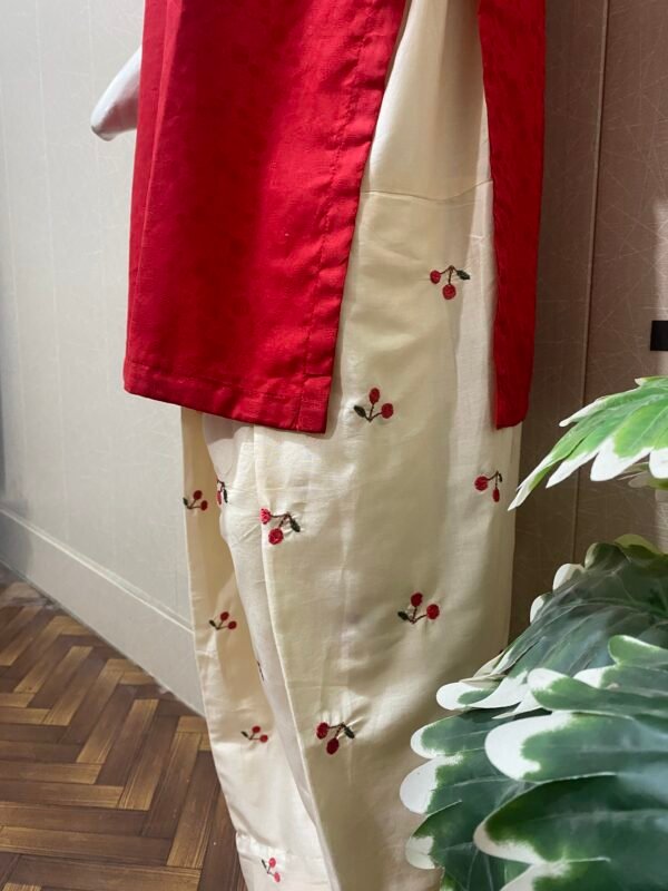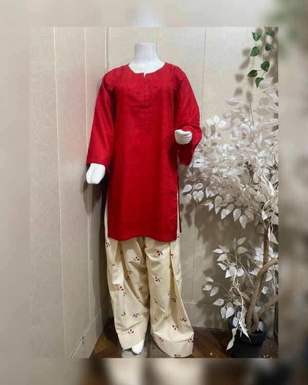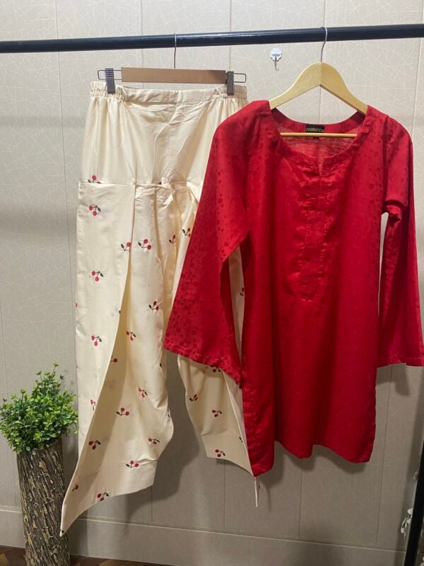 Cherry embroidered 2 pc stitched dress, very soft and breathable lawn stuff, fully embroidered farshi shalwar with beautiful self printed red blood color’s shirt