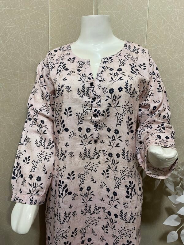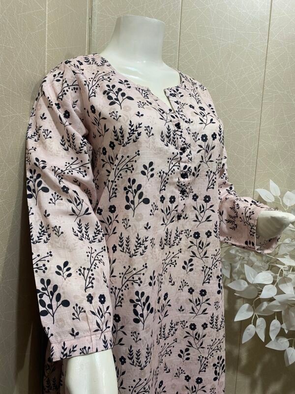 Its 2 pc stitched dresse, beautiful digital printed soft khaddar, shirt wt straight trouser. Pearls detailing wt ban neckline, small cuff sleeves.
