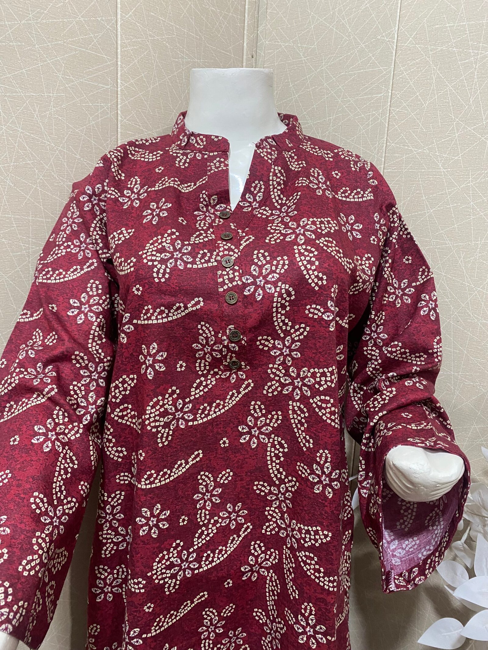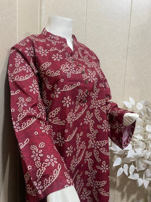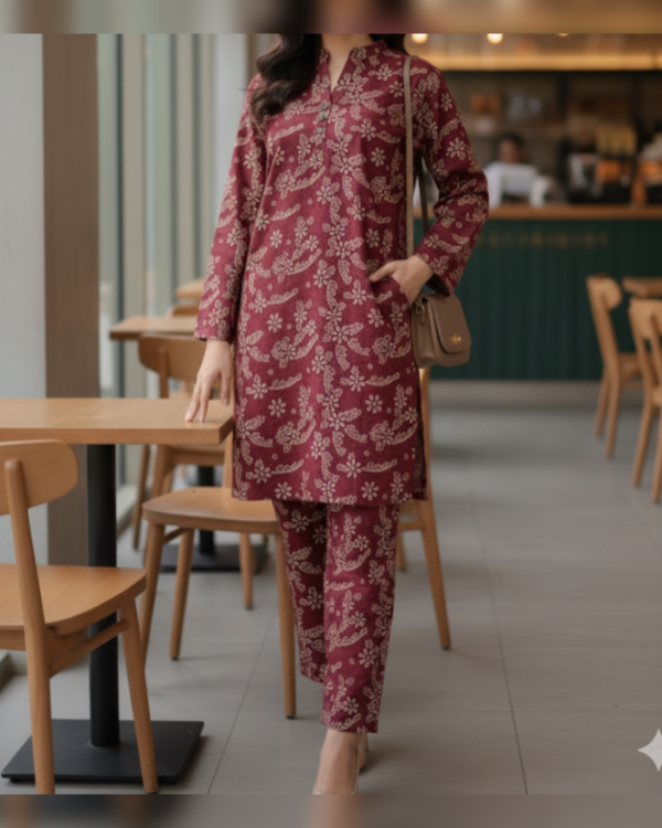 Its 2 pc stitched dresse, beautiful digital printed soft khaddar, shirt wt straight trouser. Button detailing wt ban neckline, loose fit sleeves.