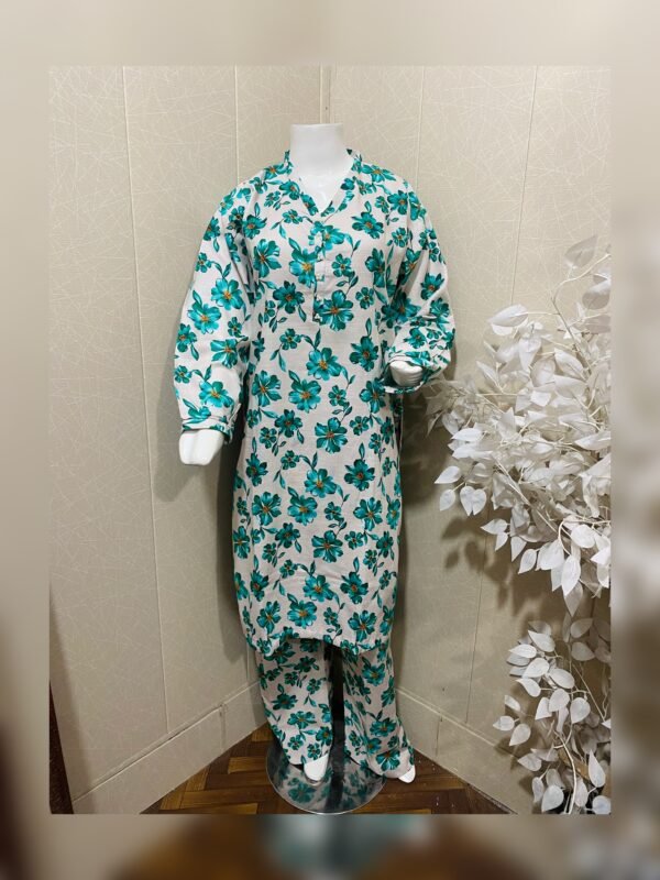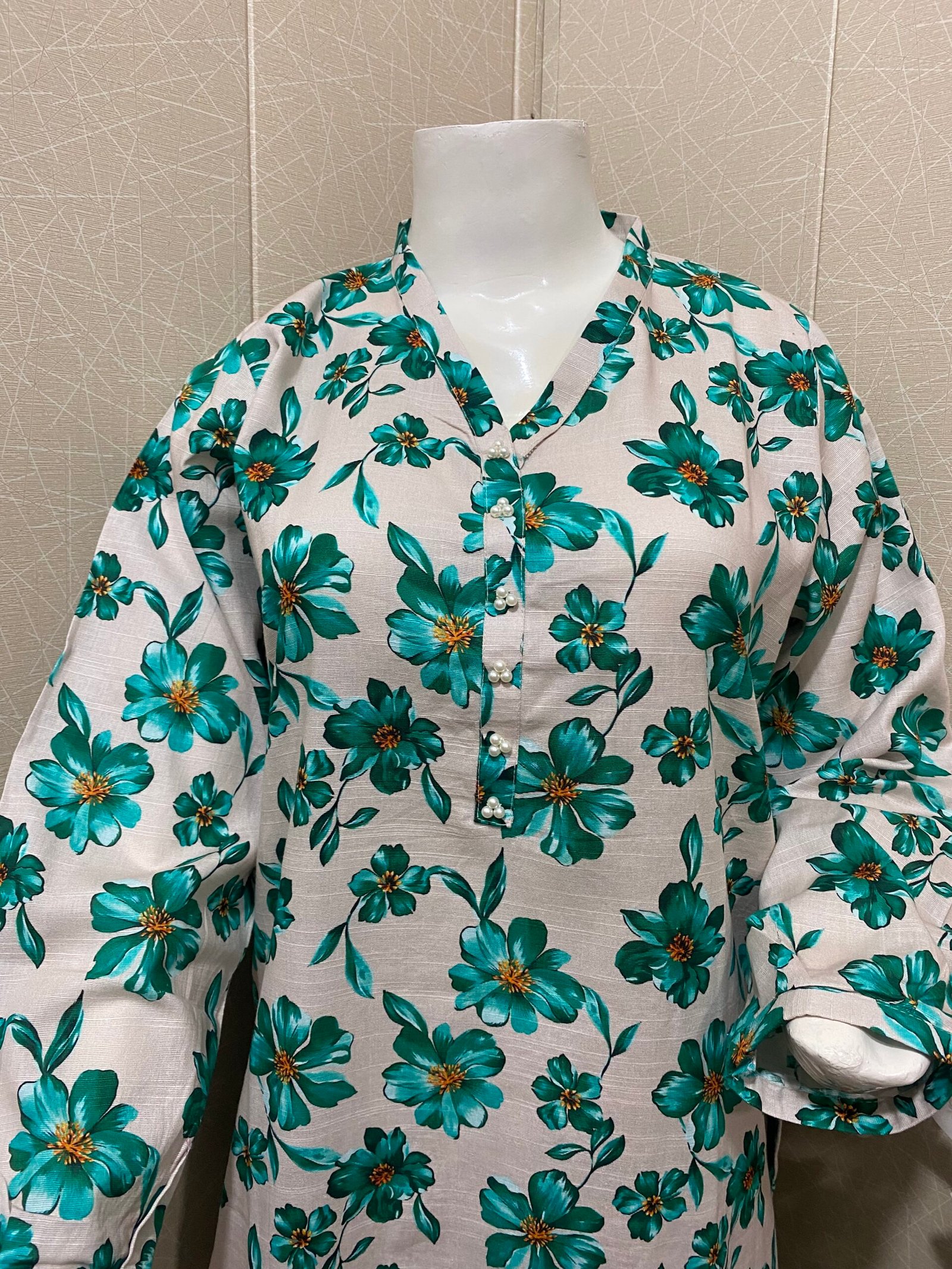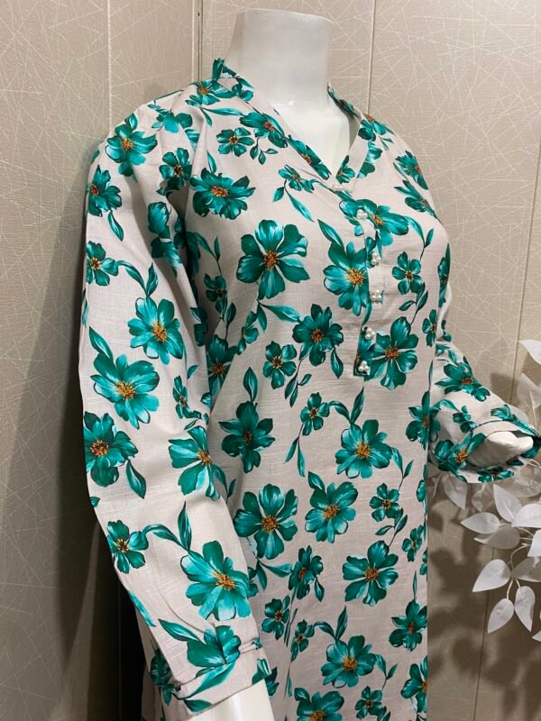 Its 2 pc stitched dresse, beautiful digital printed soft khaddar, shirt wt straight trouser.pearls detailing wt ban neckline, small cuff sleeves.