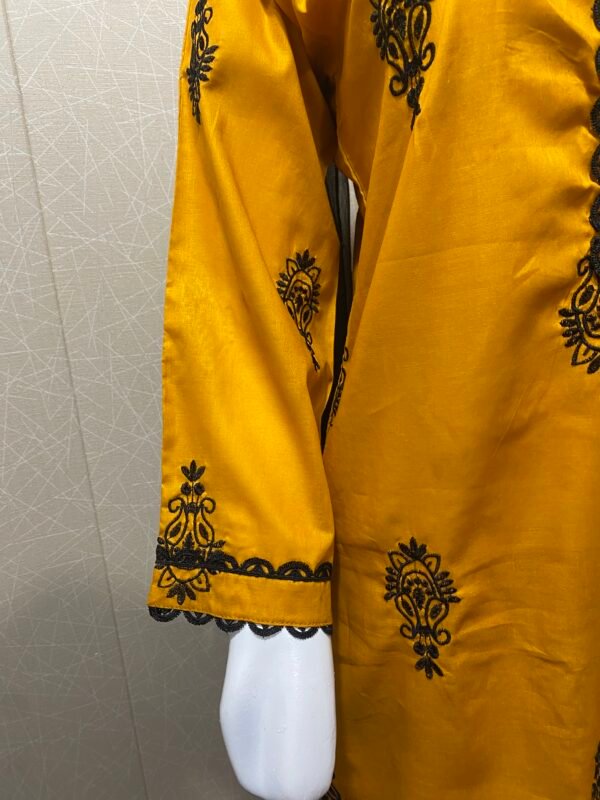 Its 3 pc stitched co- ord set with beautiful embroidery on shirt front, back and sleeves and trouser ,very soft and breathable stuff, Musturd color wt black embroidered Motives .Button and lace detailing on shirt and also lace on sleeves complete its look.